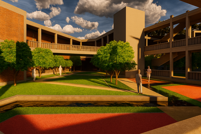 The site design uses vegetation on the east and west sides as visual and sound barriers while also providing shade, and courtyards are oriented to remain cool throughout the day. Natural airflow is directed through the layout, with shading elements reducing heat gain and improving comfort near the road and within the building.